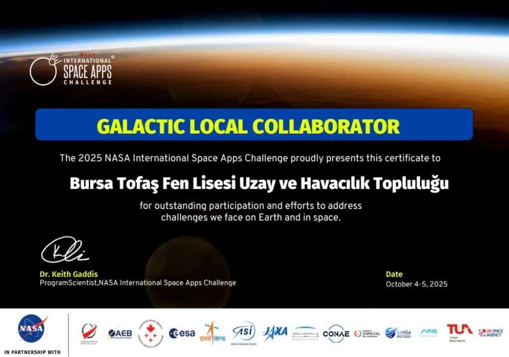 4-5 Ekim 2025 tarihinde gerçekleştirilen NASA Space Apps Challenge 2025'te okulumuz öğrencileri 48 saat boyunca seçtikleri kategorideki sorunlara çözümler üretti. Bu 48 saat içinde yarışmacılar seçtikleri sorun hakkında NASA'nın açık verilerini kullanarak çözümler üretti ve bunları bir sunuma döktü. Space Apps Bursa kapsamında katılan 70 takım arasında ilk 30'da "Space Kings", "Yekta", "Astro Capybaras", "astroC0D3" ve "ROCKETS" adlı 5 takımımız yer aldı. Bu takımlarımız arasından okulumuz 10/A sınıfı öğrencilerinden Emir Sakarya'nın kurucu olduğu "Astro Capybaras" adlı "Alçak Dünya Yörüngesinde Ticaretin Geliştirilmesi" konusunu elen alan takımımız birinci olurken "Yekta" isimli takımımız "Yapay Açıklıklı Radar ile Dünya Süreçlerini Ortaya Çıkarmak" kategorisinde çözümler üreterek ikinci takım olma hakkı kazanmıştır.